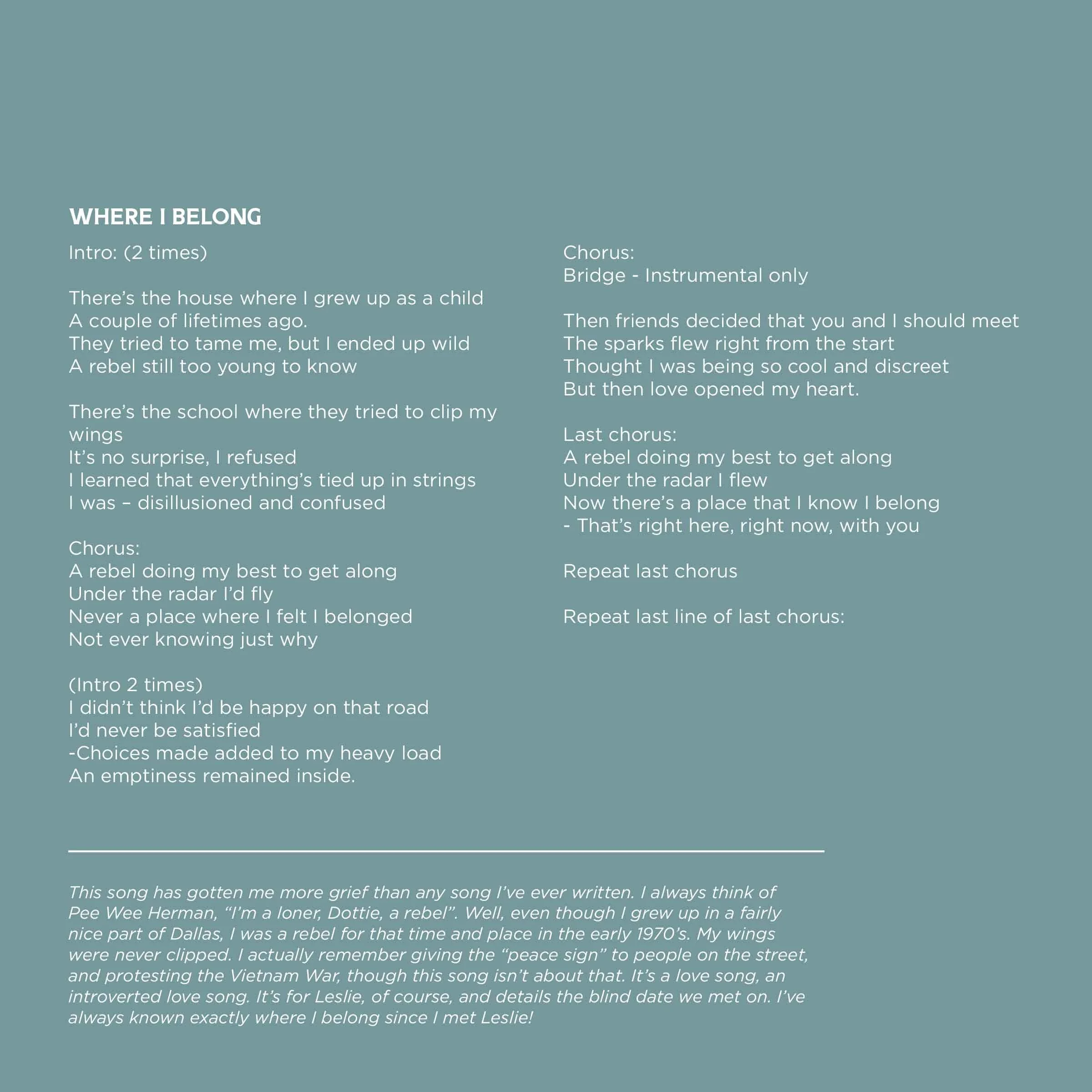 This song has gotten me more grief than any song I’ve ever written. I always think of Pee Wee Herman, “I’m a loner, Dottie, a rebel”. Well, even though I grew up in a fairly nice part of Dallas, I was a rebel for that time and place in the early 1970’s. My wings were never clipped. I actually remember giving the “peace sign” to people on the street, and protesting the Vietnam War, though this song isn’t about that. It’s a love song, an introverted love song. It’s for Leslie, of course, and details the blind date we met on. I’ve always known exactly where I belong since I met Leslie!